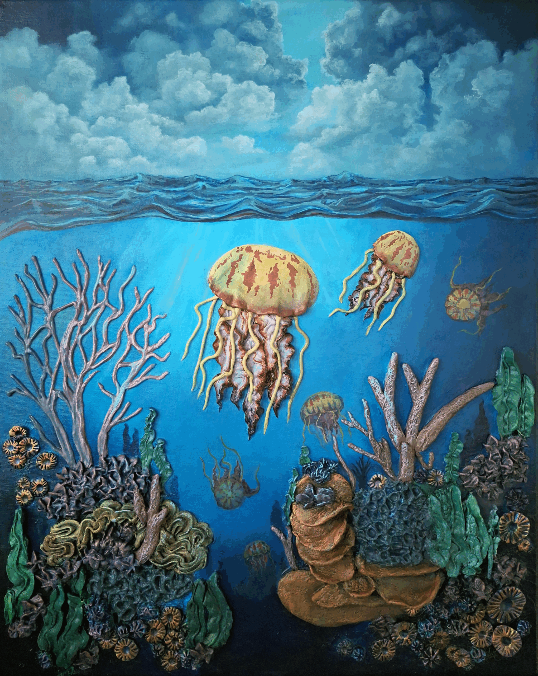 Waves start swell as storm clouds roll across the sky dimming any light with heaviness of hardships. We have all weathered storms. There are times of darkness as the storms of life come. The unrelenting force of nature and that of the free spirit still carry on. The stripped jellyfish often display behaviors of surfacing as the waves crash amongst each other in upheaval and dismay. Resilience isn’t measured by how big or small we are. Sometimes there is no fighting the waves of the oncoming storm. Sometimes we must have perseverance like the stripped jellyfish and flow with whatever may come knowing that the light will shine again.