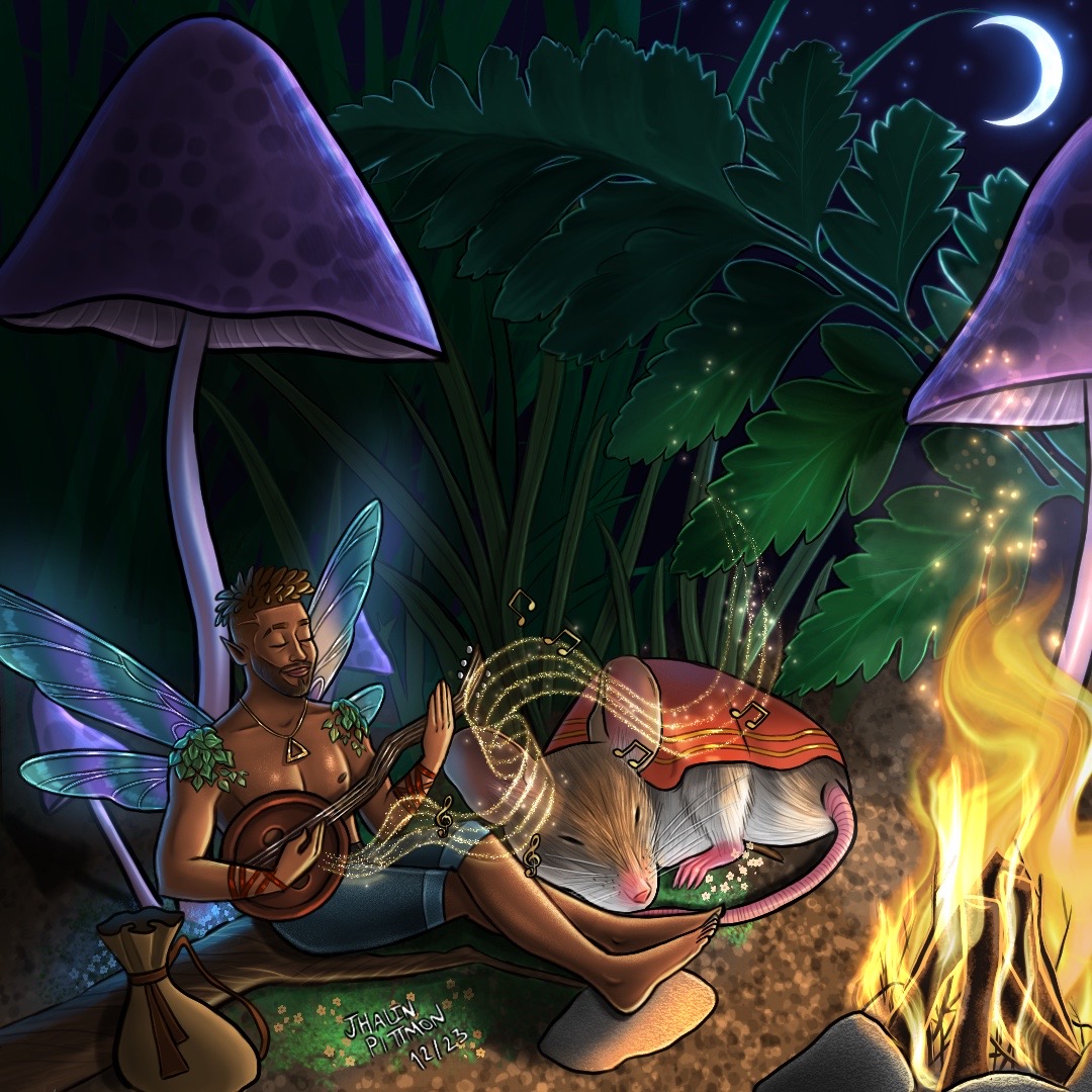 This image portrays a male pixie playing a guitar beside his sleeping pet mice near a bonfire, set deep within a meadow under the night sky. Surrounded by grass, mushrooms, and flowers, the scene is meant to evoke a sense of whimsy and tenderness, emphasizing the gentle bond between the pixie and his pets.