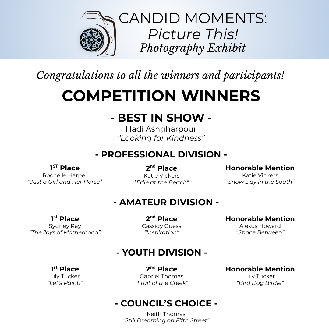 Sometimes, the most powerful stories are the ones we don’t plan to tell.” CANDID MOMENTS: Picture This!” celebrates the unscripted — photos that capture honest, fleeting, and unfiltered moments of life. Photographers of all experience levels, from youth to professionals, responded to an open call for submissions. The images on view were selected through a competitive jury process based on artistic merit, emotional resonance, and connection to the exhibit’s theme.